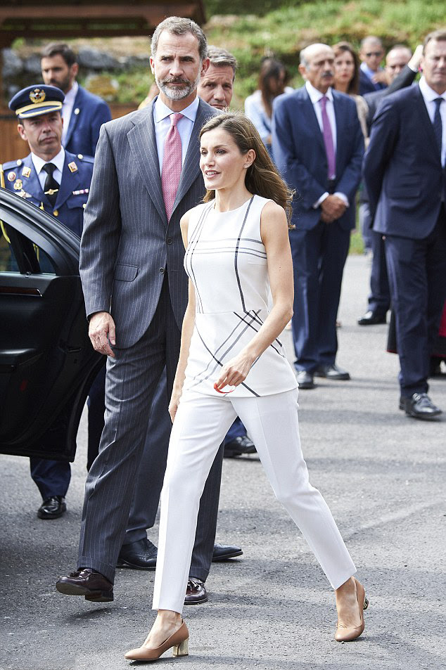 | Queen Letizia of Spain resplendent in a figure-hugging Roland Mouret crisp white, below-the-knee pencil skirt and emerald green top, she paired with nude pointy heels and a matching green clutch. The Spanish Queen was the main attraction as she arrived at music awards on Friday July 21, 2017. |