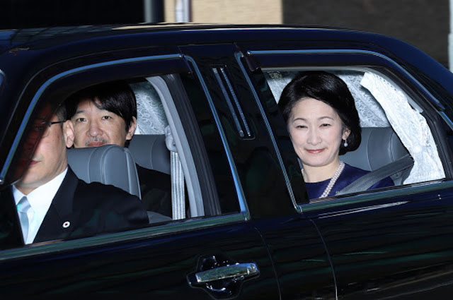 | (back-left) Prince Akishino and Princess Kiko of Akishino are seen on arrival at the Imperial Palace on January 2, 2018 in Tokyo, Japan. |